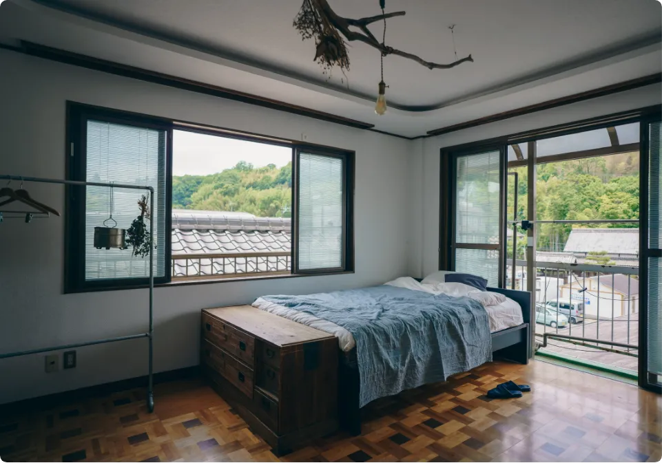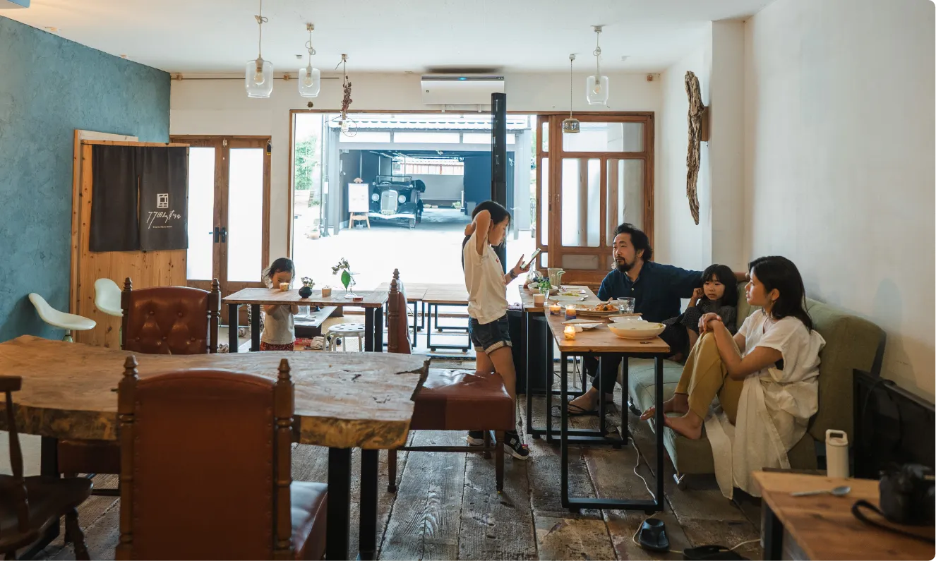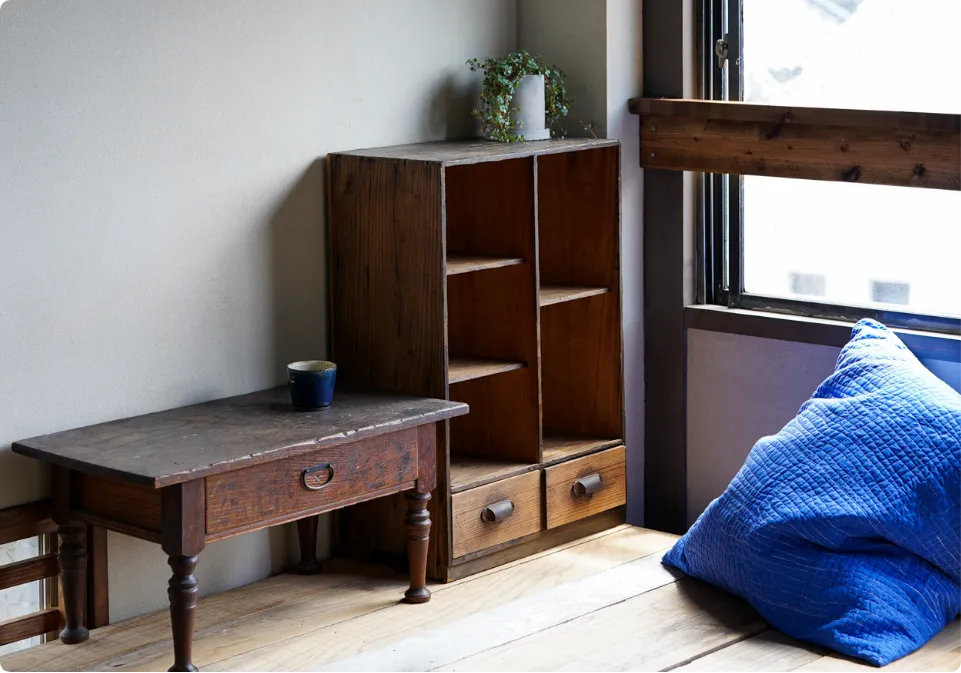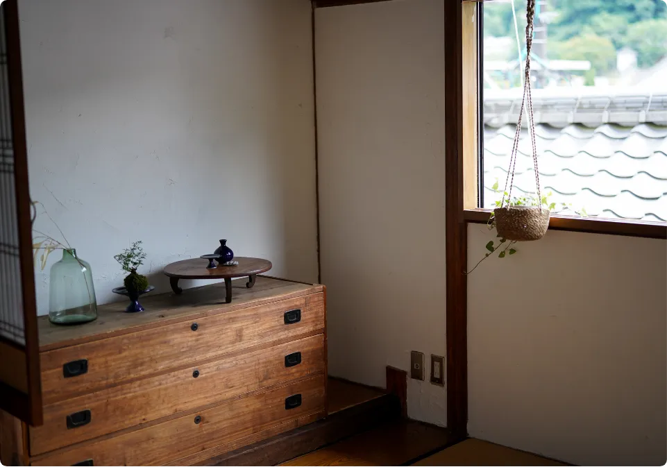 築50年を超える物件をセルフリノベーションしました。素材には大分の漆喰と床材、古材などを活用し、家具・食器も、アンティークや地元作家の作品を取り入れてそろえました。暮らしを通して、土地のいとなみを感じることができます。