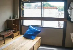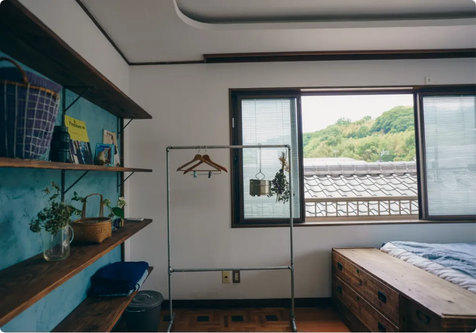 レトロなフローリングを生かして、壁は真っ白に塗り直しました。収納がない部屋なので、一つの壁はまるまる棚に。棚のバックの壁は、ブルーグリーンの漆喰を。お気に入りのものをディスプレイしても映えますよ。窓からは、愛染堂という縁結びの神社、御客屋敷という築200年の文化財が見え、竹田ならではの景色が楽しめます。