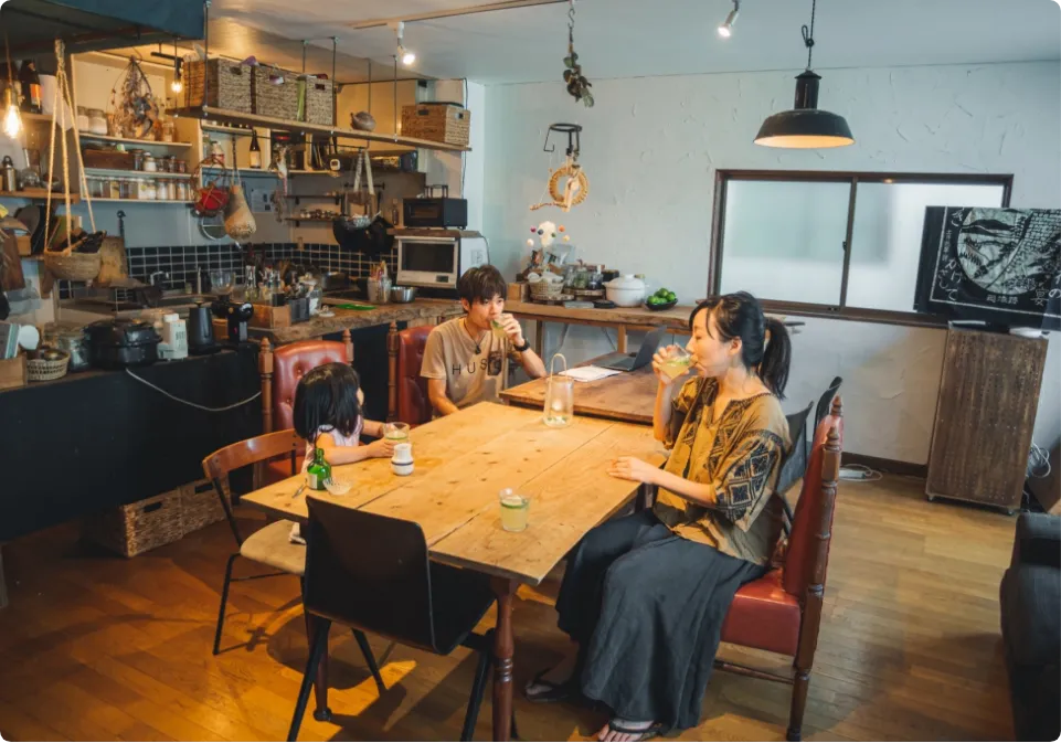 私たち夫婦と3人の子ども、そして5人の住人。合わせて10人で暮らしています。人が多いけどみんなそれぞれの時間を送っているので、繋がり方はゆるく、そして自由。常に集まり、話すというより、誰かと話したい時に、話す相手がいる場所。くだらないことで笑いあうことが多いけど、話したいならディープな話もいくらでもできる。