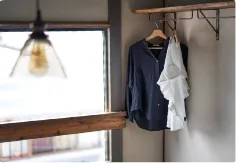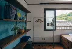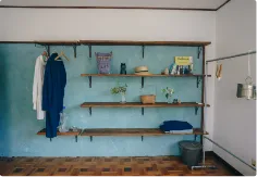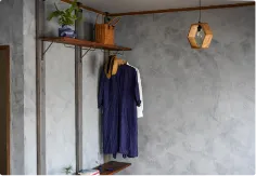 アンティークのタンスの上に、木の棒を渡して、服がかけられるようにしていたり、もともとは仏壇を入れるための棚に板を置き小物が収納できるようにしたりと、収納を増やしています。