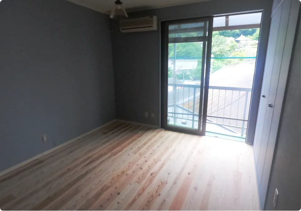 ブルーグレーの壁に、白い天井。床は、日田杉をうずくりという独特な凹凸感のある加工をしたフローリングです。この部屋は、収納だらけ。押し入れも広いんですよねぇ。