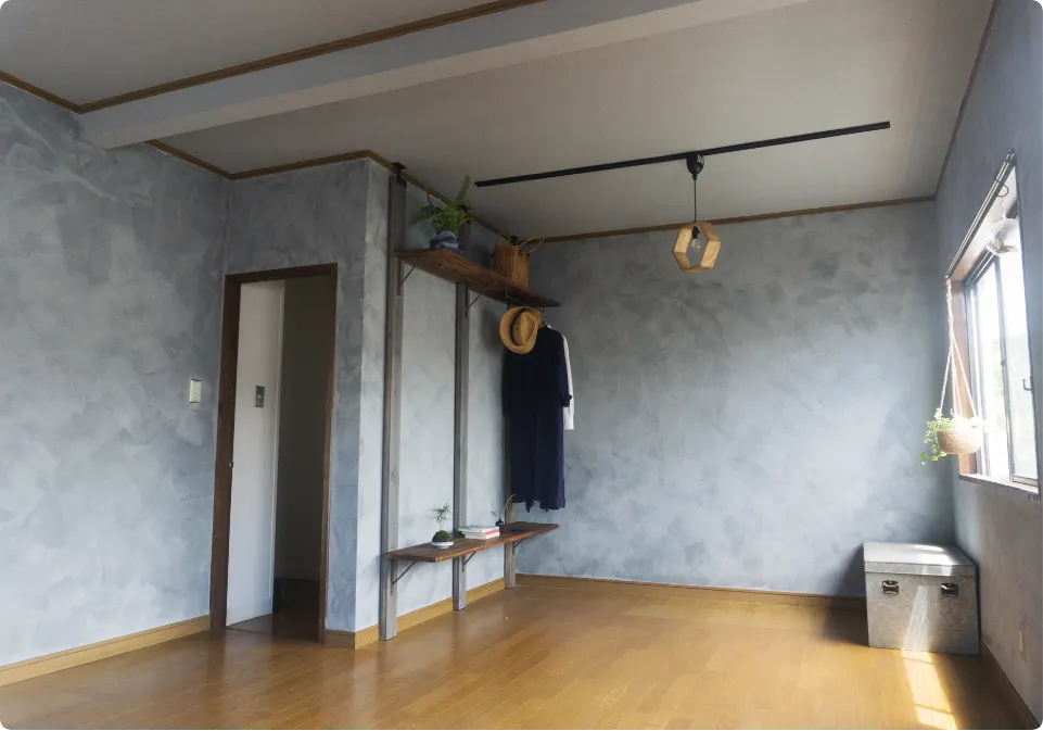 ブルーグレーに、グレーを塗り重ねてニュアンスをつけた壁。