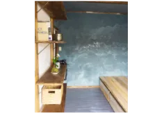 壁は大分・津久見の漆喰をみんなで塗ったり、古材を貼り付けたり。初めてのDIYでいろんな実験をしました。