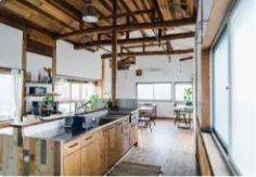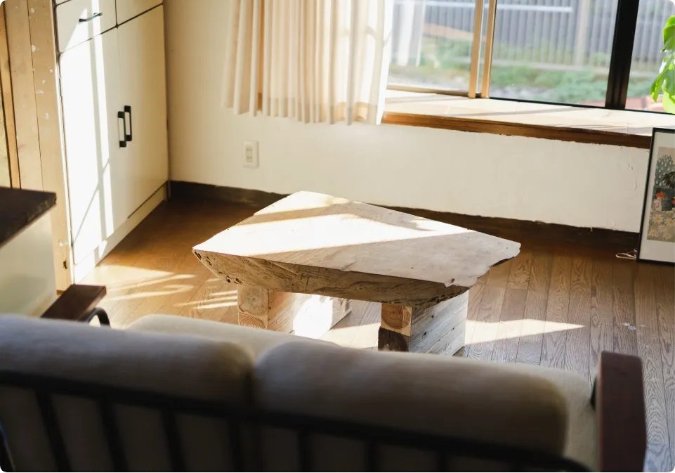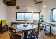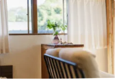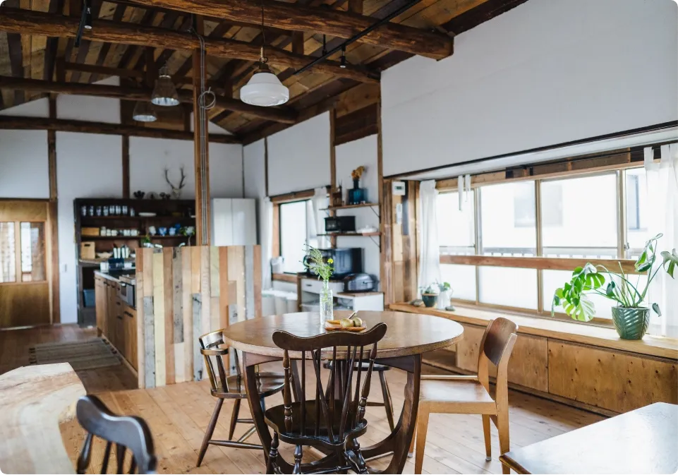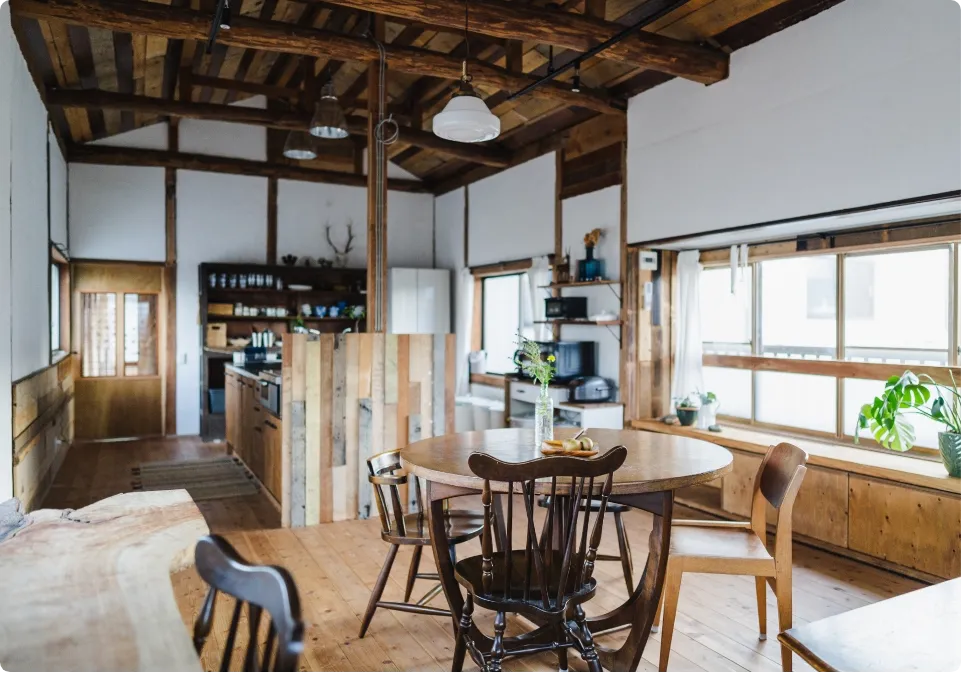 土地の記憶と歴史とのつながりを大切に、リノベーションしました。この土地の古材やアンティークなものたちを活用し、大分の漆喰や無垢の杉材で空間を作りました。広い窓で、風が抜け、朝日と夕日や、季節の移ろいが暮らしているだけで目に入る、心地いい空間。