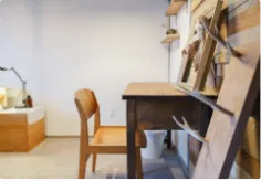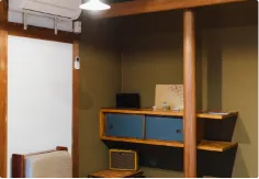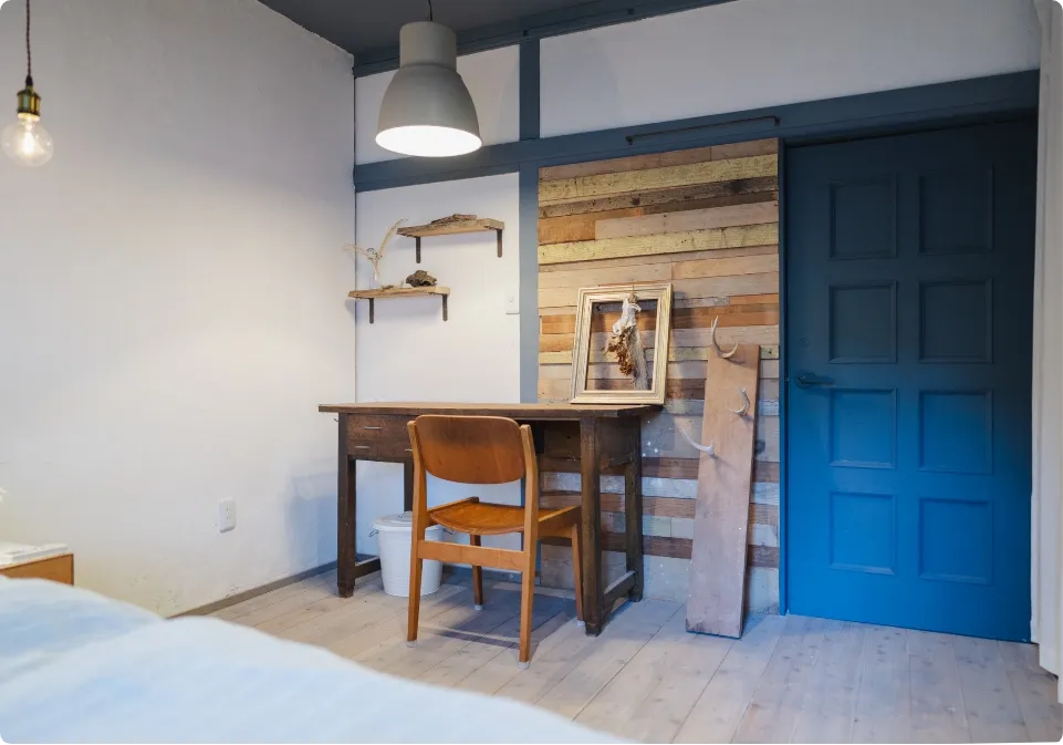 佐伯の歯医者さんで使われていた机の前には、古材で飾った壁。元々は看護師さんたちの控え室だったようです。畳だった部屋の床を日田杉で張り替え、壁は大分津久見の漆喰で仕上げました。