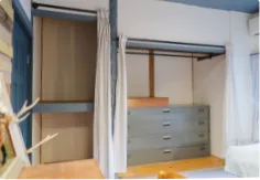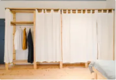 収納もたっぷり。片面一面収納で、奥行きも広い!ものを隠せるようにカーテンをつけているので、生活感なく、すっきりと過ごせます。