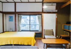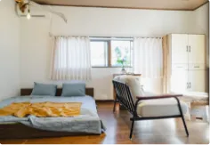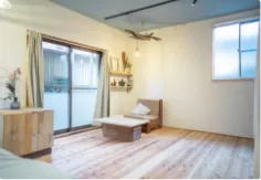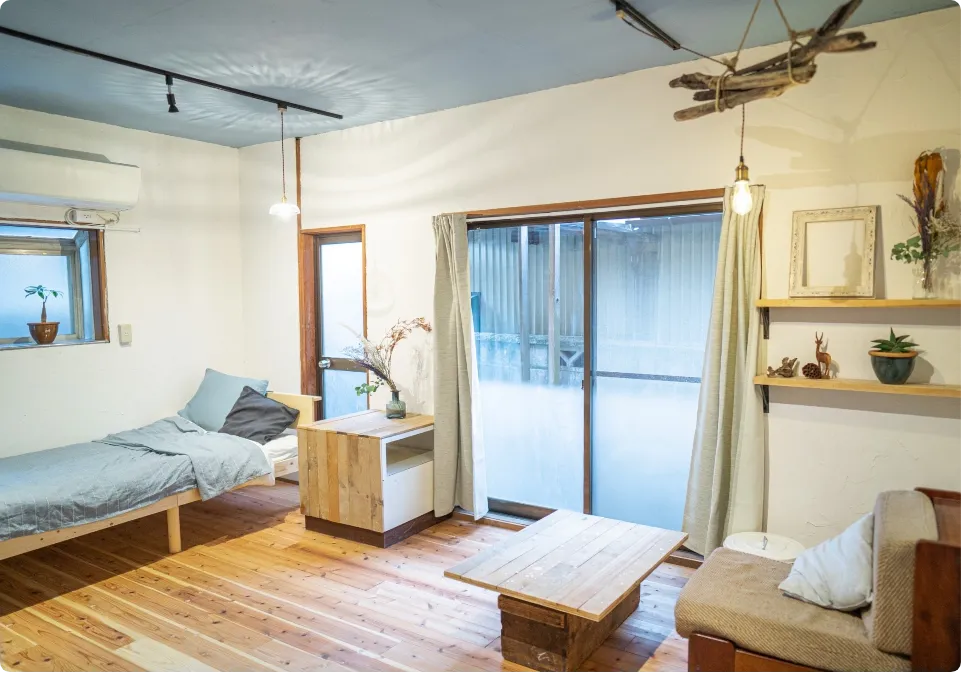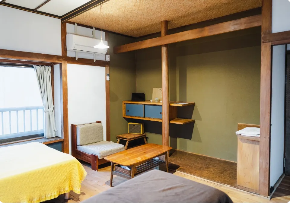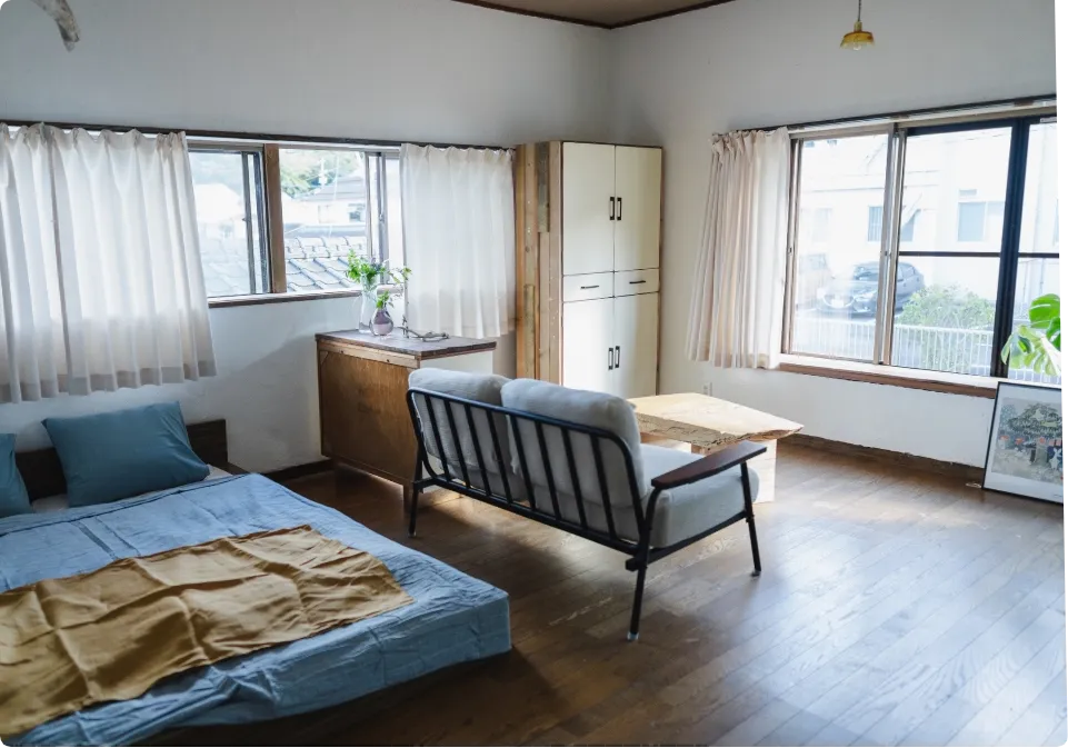 明るく、風が通る気持ちのよい部屋。畳貼りを無垢のフローリングに変更したり、ペンキで色は変えましたが、元々の古い装飾は残して仕上げました。ベッドとソファ、テーブルを置いても広々。