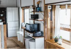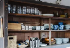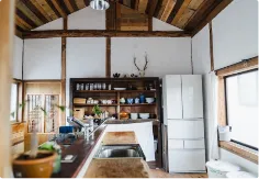 空間作り、素材、置いている家具や小物。自然と土地とのつながりを見つめ、選択を繰り返してきました。地元の天然素材や、古いもの、捨てられてしまうかもしれないものを積極的に使い、環境にやさしく住んで心地いい、を目指しました。暮らしに必要な道具は、食器や調理器具など一通り揃っています。